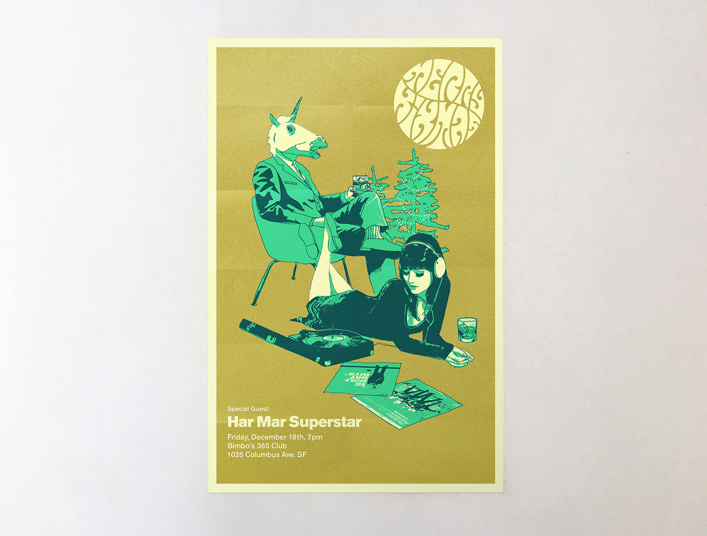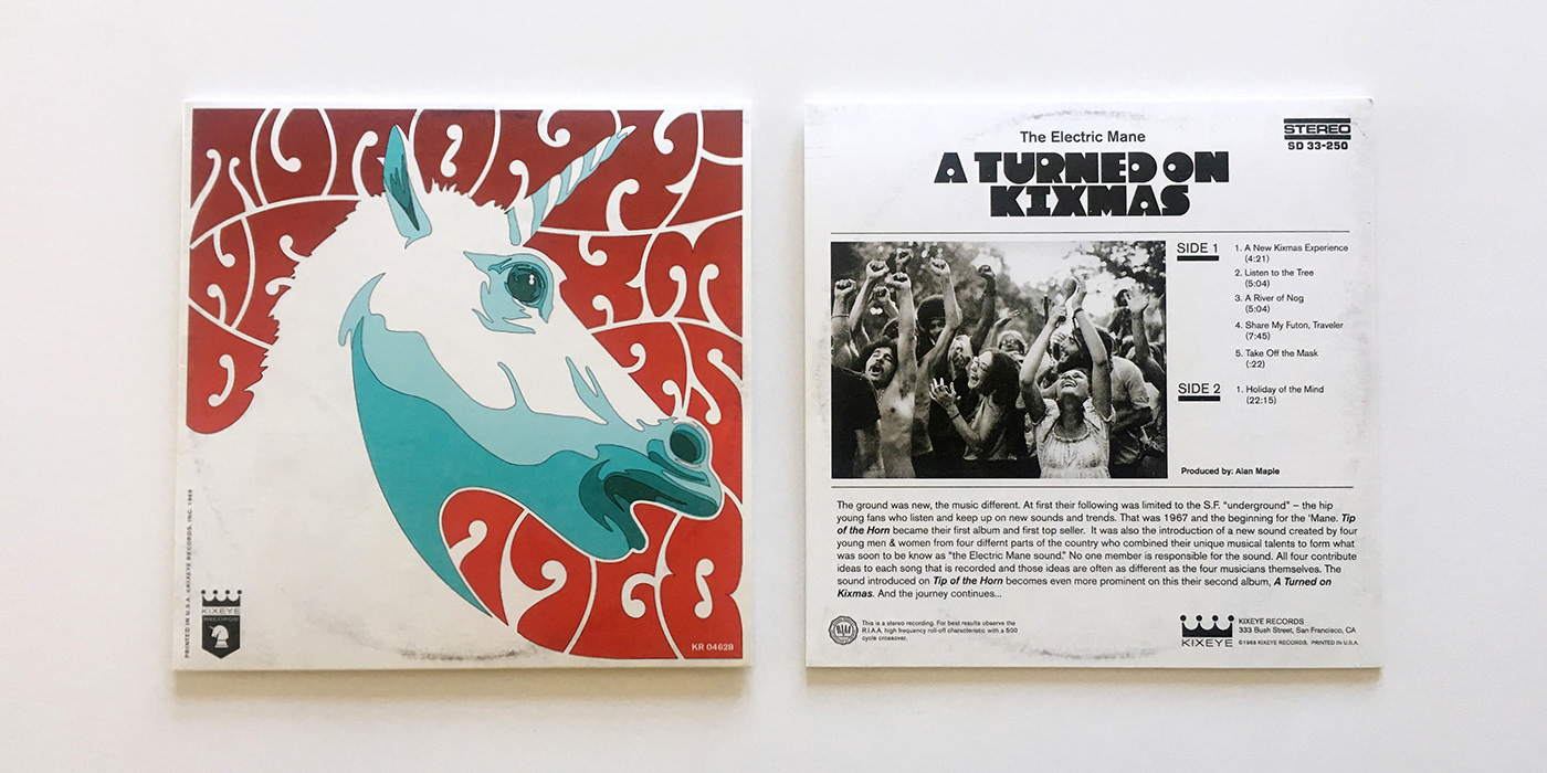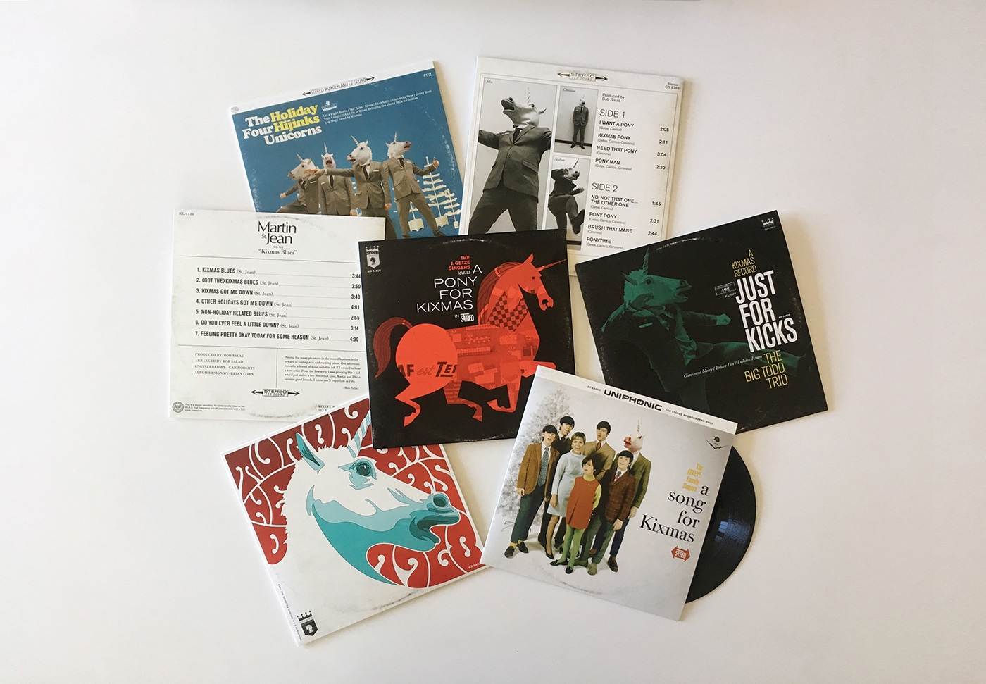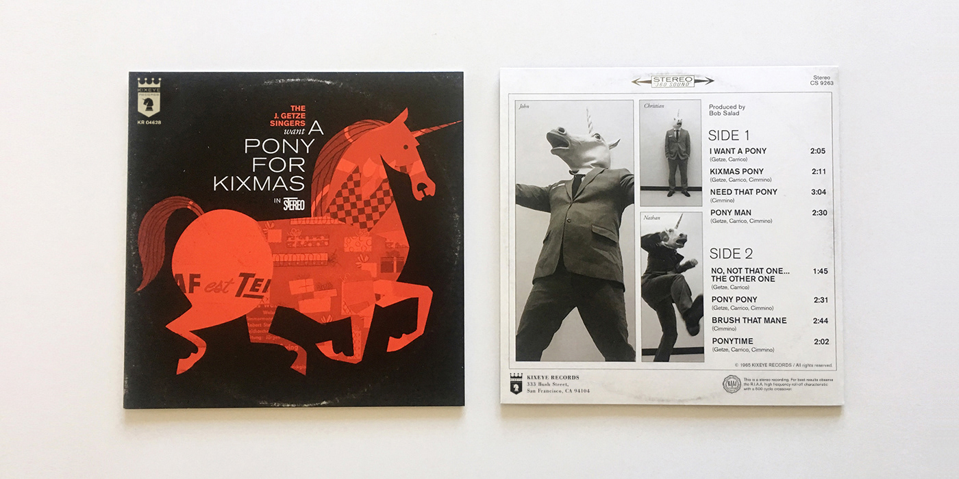 A collection of fake vintage 7" singles designed as takeaway gifts - plus event logo & poster for Kixeye's annual holiday party. Each record sleeve features a company-specific fictitious artist, original track listings, artist info, fake record company logos, etc. We did the writing, design, illustration, & production management for this project.